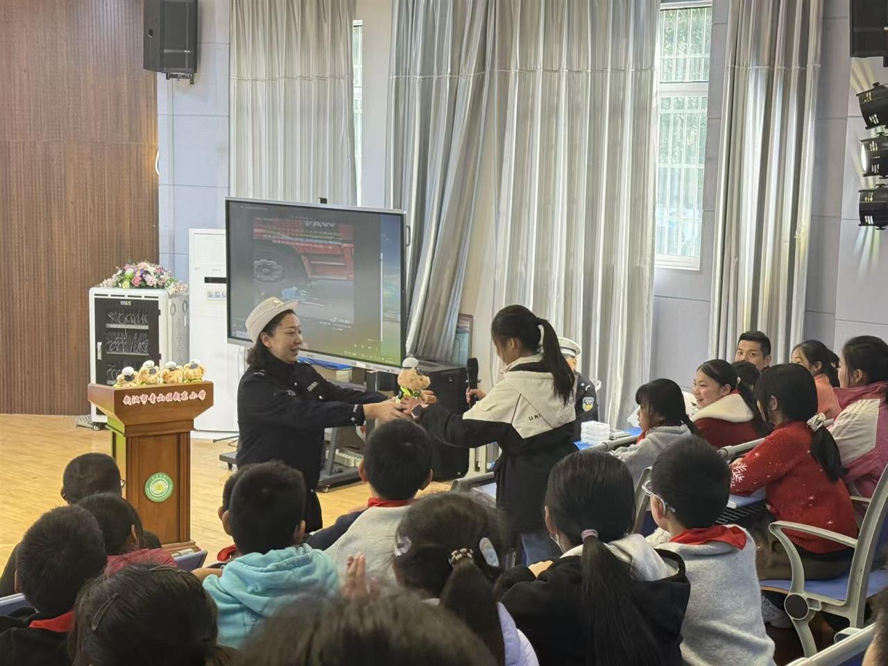 在互动问答环节,“红灯亮时能否通行”“乘车时头部能否探出窗外”等贴近生活的问题引发热烈讨论。学生们踊跃举手抢答,民警现场纠正错误认知。对表现优异的同学,还送上交警小熊等礼品。“视频里闯红灯被撞的画面让我特别震惊,以后一定看绿灯再走。”孩子们纷纷在活动后表示。
