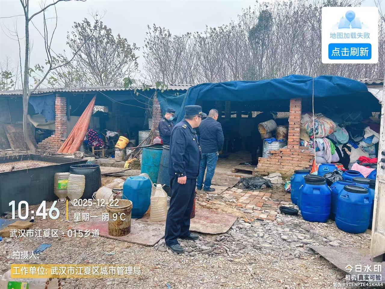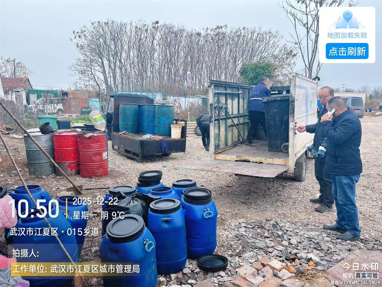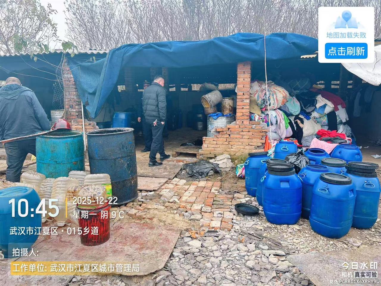 12月20日,武汉江夏区城管综合执法大队接到举报称,在藏龙岛栗庙路存在一处非法加工油脂的窝点。12月22日,当执法人员抵达举报所指位置时,发现该地点因区划调整,实际已属东湖高新区滨湖街道大咀湾辖区。
