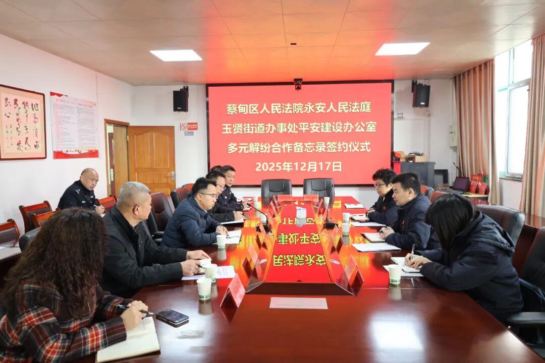 近日,武汉市蔡甸区人民法院永安法庭与玉贤街道平安建设办公室在玉贤街道办事处举行多元解纷合作备忘录签约仪式,共同签署《关于创建“枫桥式”人民法庭推动矛盾纠纷多元化解实施方案》。玉贤街道党工委副书记、办事处主任郑全海,蔡甸法院党组成员、副院长刘庆荣,玉贤街道党工委副书记周自力出席仪式。