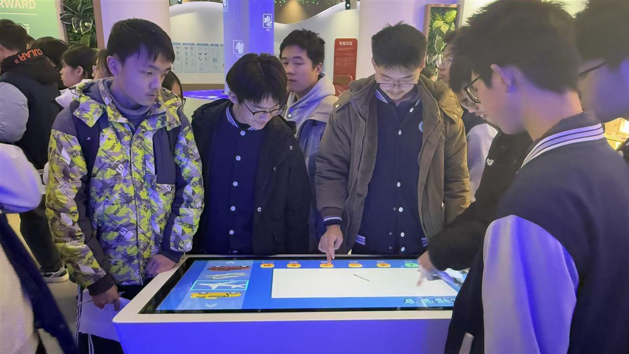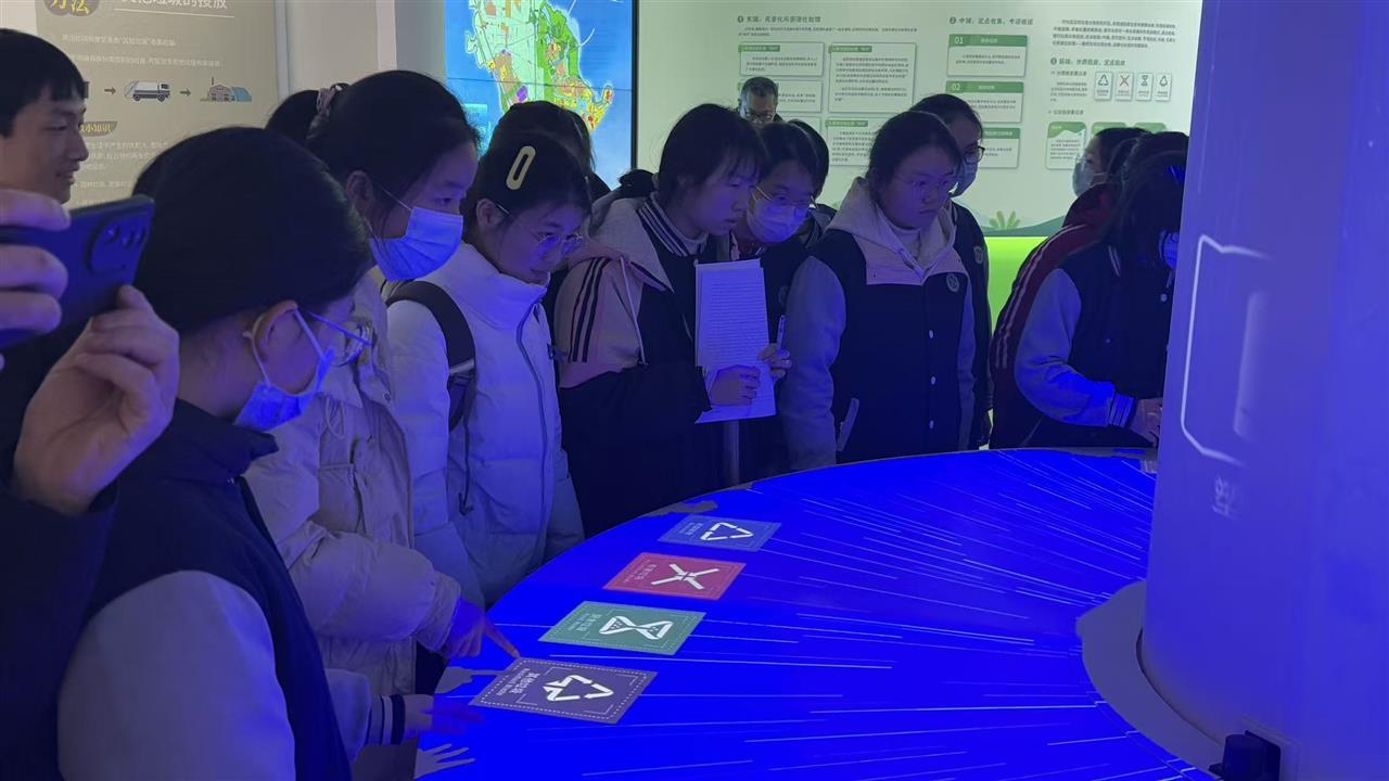 研学第二站,来到东西湖区垃圾分类宣教馆,这里的垃圾分类知识既直观又有趣。刚一进馆,高清语音介绍屏幕、收运路线互动屏、智能分类投放柱等现代化互动设施,就牢牢吸引了大家的注意力。同学们迅速分成小组,围在互动设备前踊跃尝试:有的对着投放柱反复练习分类投放,直到屏幕显示“投放正确”才露出笑容;有的在收运路线互动屏上点击操作,直观了解不同垃圾的收运去向。在轻松有趣的互动氛围中,同学们不仅精准掌握了垃圾分类的标准,更认识了我区垃圾“分类投放——专业收运——集中处理”的闭环体系。