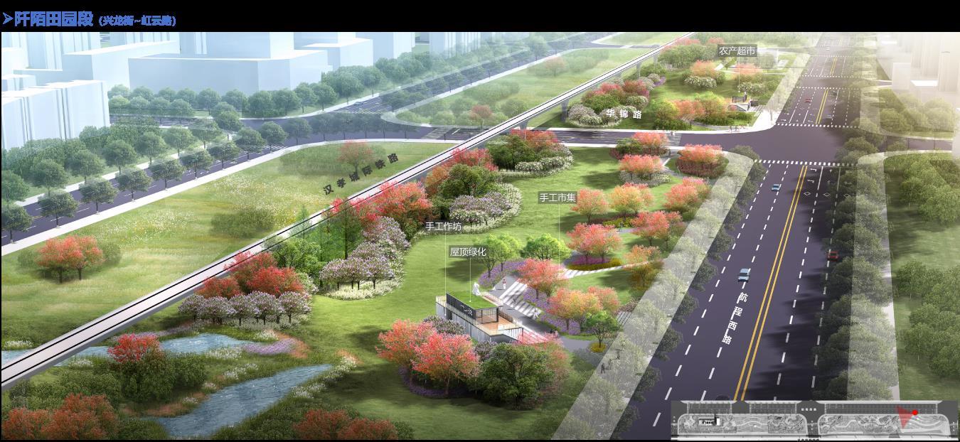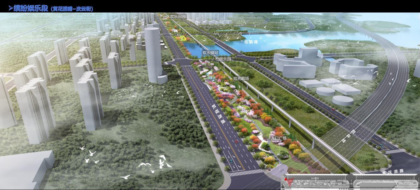 该项目全长3113米,红线宽45米,建设内容包括场地平整、园路、广场、绿化工程、配套服务用房、地面停车场、景观亮化、给排水及海绵城市建设等配套设施。在景观结构上,设计采用“一带四段十点”布局:“一带”聚焦一条生态功能结合的渗透型绿带,集生态观光、娱乐购物和运动休闲于一体;“四段”涵盖缤纷娱乐、焕彩商业、阡陌田园和活力运动区域;“十点”则细分为拾光剧场、松鼠乐园、林下清溪、花田巷子、如茵广场等节点,增强空间的多样性与互动性,为市民提供沉浸式休闲体验。