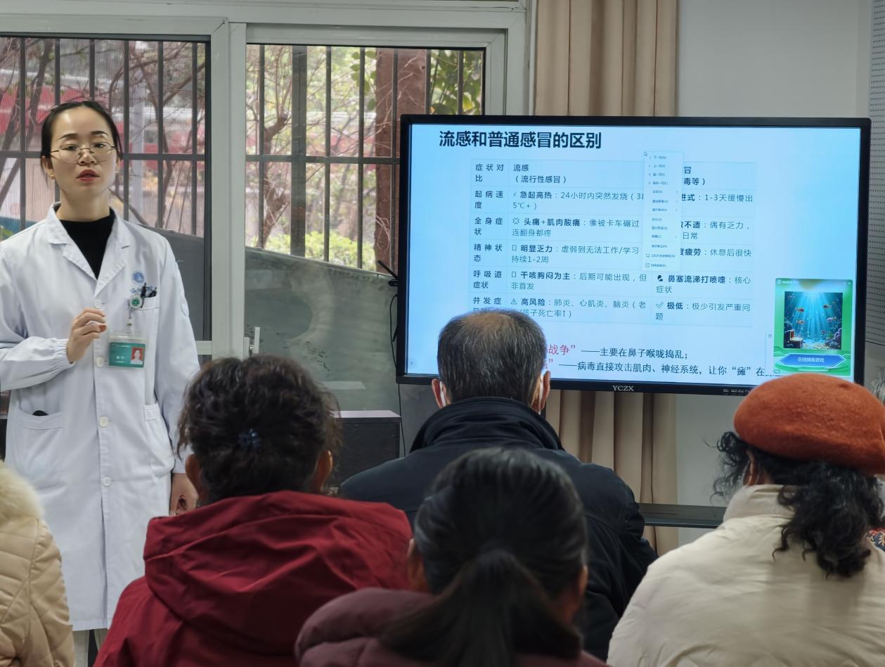 现场,刘教授结合丰富的临床经验,围绕流感、肺炎、诺如病毒感染等秋冬常见传染病展开讲解,从传播途径、典型症状到预防手段,进行了全面且细致的科普。针对老年人免疫力较弱、慢性病高发的特点,教授着重强调了疫苗接种的重要性,同时给出科学饮食、适度运动、规律作息等个性化建议,还提醒大家注意室内通风、勤洗手,减少聚集性活动,从细节上做好防护。