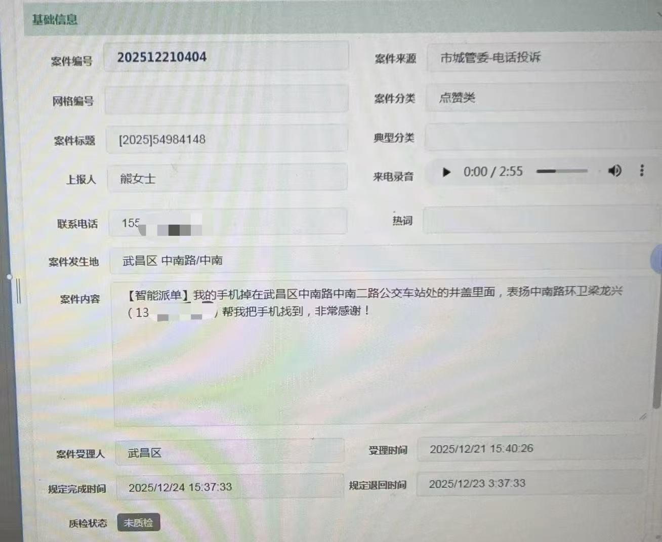 日前,市民熊女士在武汉市武昌区中南二路公交站旁等车的时候,手机不慎“溜”入下水道,武昌区城管执法局中南路清洁队环卫师傅梁龙兴见状主动相助,迅速用撬棍和长夹从下水道中完好捞起手机。熊女士拿出物资表示感谢被婉拒后,特意致电市民热线点赞梁师傅。