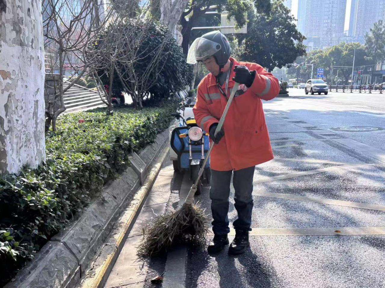 环卫工梁龙兴师傅正在进行清扫保洁作业