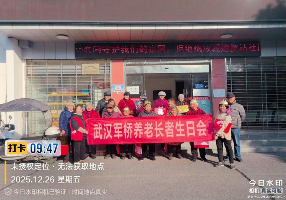 12月26日,在武汉江夏山坡街贺站社区活动室内,二十余位平均年龄超过80岁的长者齐聚一堂,共同参与由贺站社区与军桥养老联合策划的“时光礼物”集体庆生会。这场以“关爱高龄老人,共享幸福晚年”为主题的特别活动,不仅为老人们送上了生日祝福,更通过一份精心设计的“时光礼物”,传递出持续全年的暖心关怀。