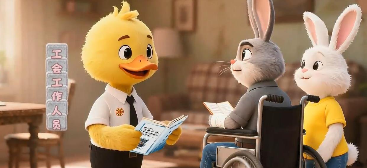 新闻记者观影看到,这段创意动漫时长99秒,由武汉市总工会出品,楚天都市报新闻制作。动漫讲述了女大学生小语(萌萌的小白兔饰)一家突发的窘境:父亲突发疾病,不仅一时无力承担医疗费,一对上大学的儿女学费也无着落。剧中,工会工作人员(可爱的小黄鸭饰)走进了小语的家庭,经过核实,符合困难职工建档条件,可以同时获得医疗救助、生活救助和学费救助。得到救助后,小语和哥哥能够好好上大学,父亲也能安心康复了。最后,工会工作人员与小语一家照了一张全家福,开启了新的生活。