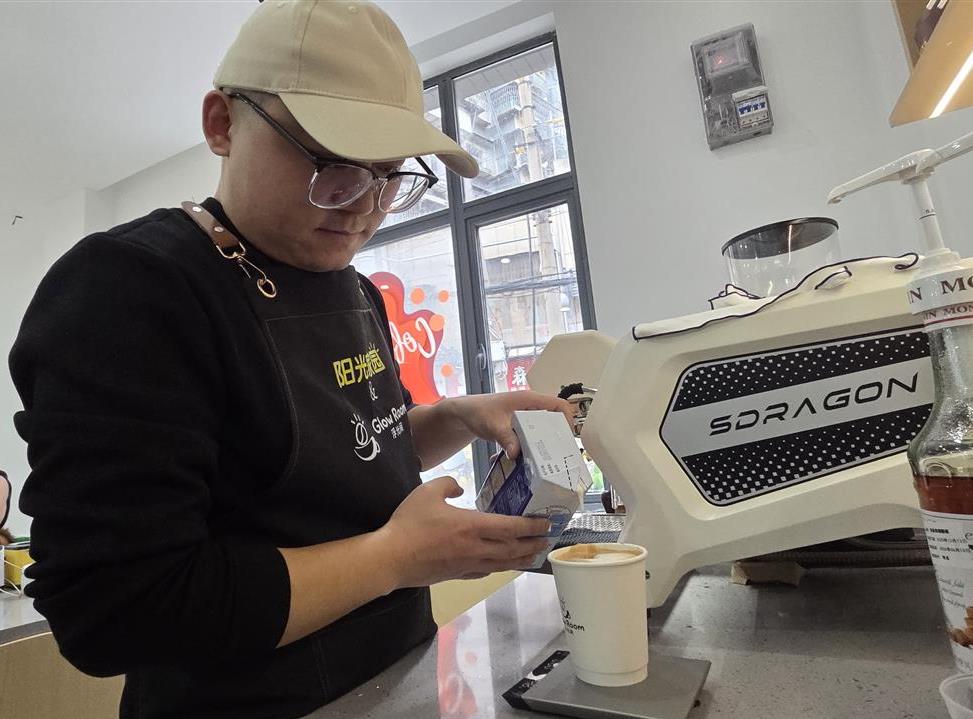 每天上午,二十多岁的小雨(化名)都会准时出现在吧台。她动作轻柔而专注,小心地称量咖啡豆,当她手腕稳定地晃动拉花缸,在绵密奶泡上勾勒出简单图案时,眼神里透着自信。“学了不到一个月,拉花已经像模像样了。”店主钱伟胜站在一旁,语气里满是欣慰。小雨是他收的特殊学员之一,来自楼上社区“阳光家园”的智力残疾青年。