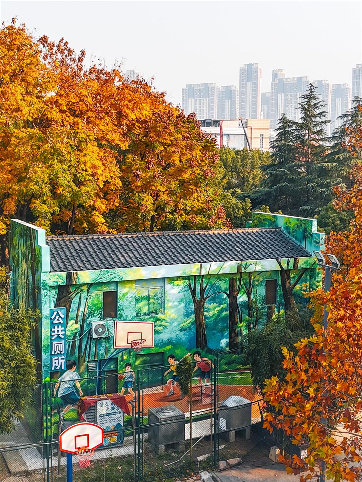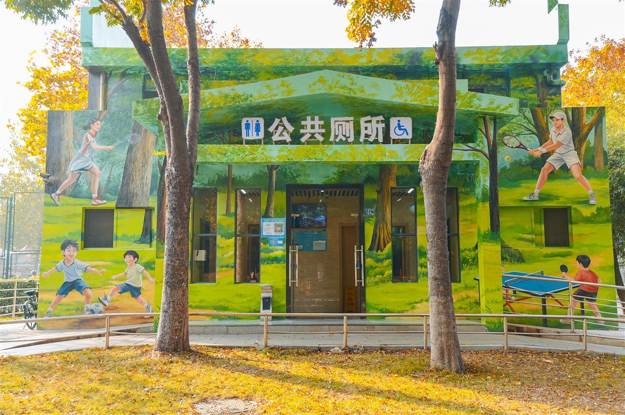墨绿色的外墙上,与周围景致相融的森林运动主题彩绘,让这座公厕在外观上就自然融入公园环境。入口处的大屏幕清晰展示厕位使用状态——红色代表有人,蓝色表示空闲。“看屏幕就知道哪间能用,不用再挨个敲门,方便多了。”常来公园锻炼的李女士表示。