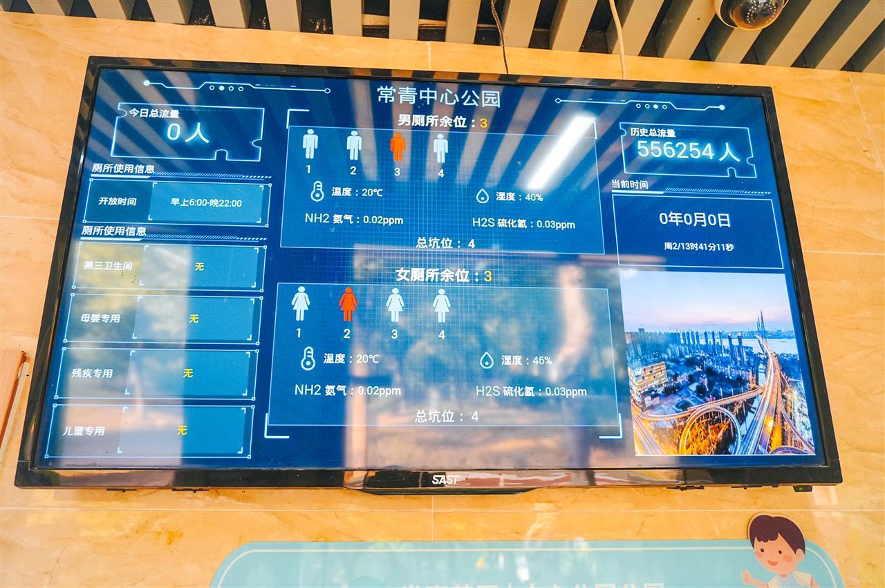这块屏不仅是市民的“找厕助手”,也服务于日常管理维护。常青花园城管执法队员王星指着屏幕介绍,屏幕上除了显示厕位状态,还实时显示温度、湿度、客流等数据,一旦空气质量下降,系统会自动报警,便于及时保洁调度。