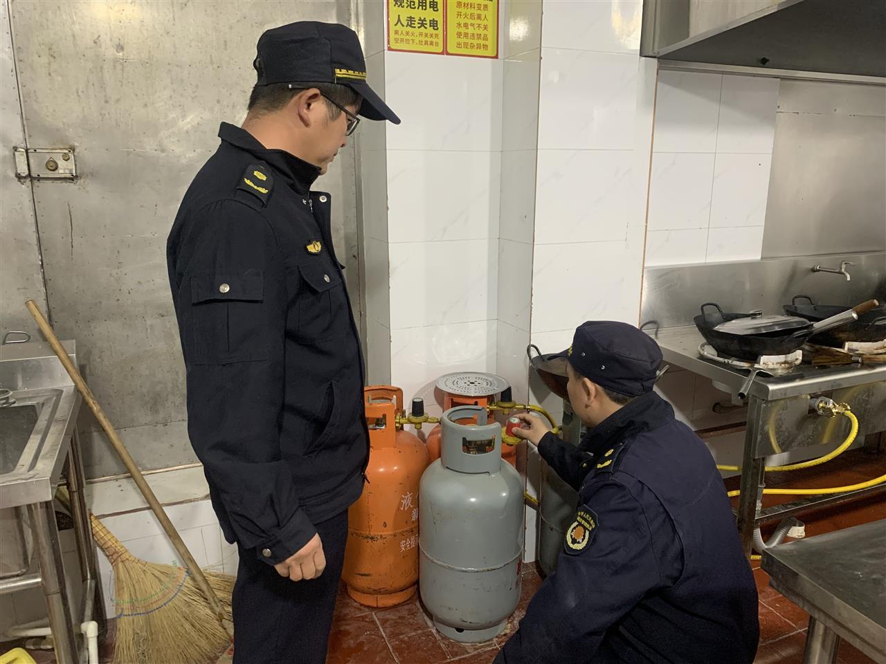 与此同时,该区城管执法局综合执法大队还针对餐饮行业开展了节前燃气安全检查。执法人员深入餐饮后厨,对燃气钢瓶、连接软管、减压阀、灶具及报警器等设施进行了细致排查(见下图),核验气瓶信息,纠正不规范存放问题,并现场指导商户整改隐患。检查过程中,执法人员同步开展安全宣传,普及用气常识和应急知识,提升商户安全意识。