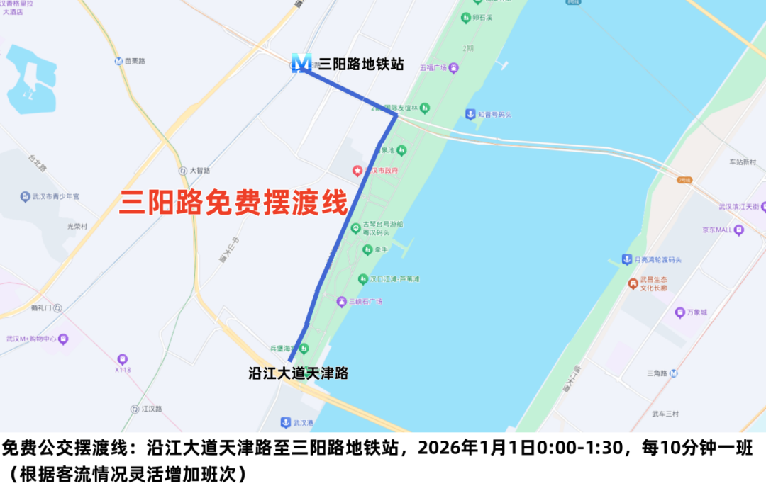 武汉两江轮渡有限责任公司发布最新通告:为保障“星光映万家——2026璀璨长江·武汉跨年光影秀活动”期间轮渡渡运安全,2025年12月31日轮渡武中线(武汉关—中华路)、江滩线(晴川—武汉关—中华路)运营收班时间临时调整为18:00。2026年1月1日恢复原运营班次时间。