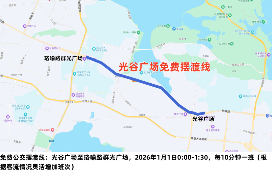 为应对跨年夜市民出行高峰,武汉在常规公交方面,将灵活调整,强化接驳服务,约30条公交线路采取缩短、绕行等方式作出临时调整。公交部门开通3条免费摆渡专线,分别在沿江大道民生路至六渡桥地铁站、沿江大道天津路至三阳路地铁站、光谷广场至珞喻路群光广场方向循环摆渡。同时,30台应急疏散公交车提前在江岸段、江汉段等指定区域停候。还将根据客流情况,散场适时增加江汉关、光谷等元旦跨年重点区域常规公交运力,以满足乘客出行需求。