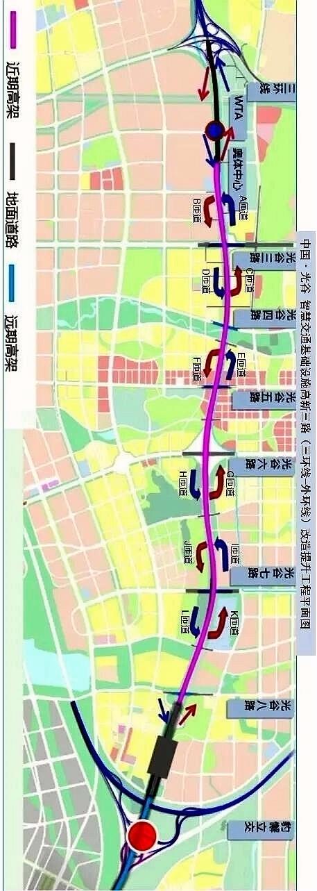 高新三路(三环线-外环线)改造提升工程起于三环线武黄立交,东至新武东收费站,规划道路全长约10.7公里,采用“主线高架6车道+地面道路6车道”的设计方案。其中高架快速路8.23公里,设计时速80公里。