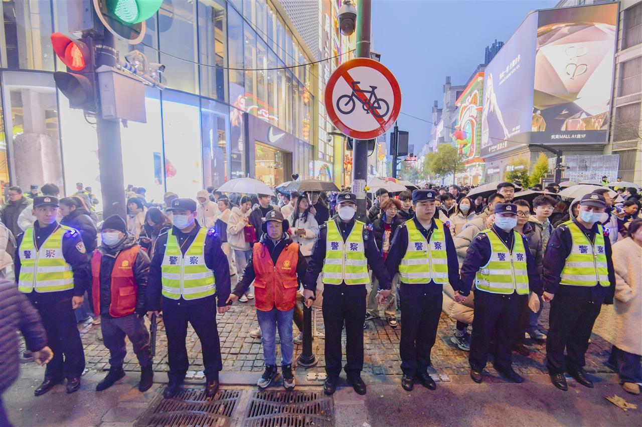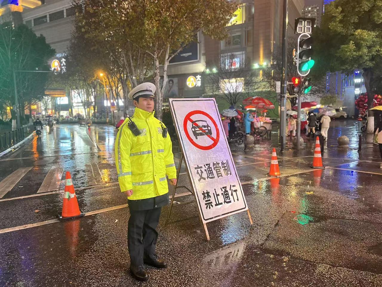 现场民警根据应急预案,立刻将中山大道江汉路口及周边区域立即实施全封闭交通管制,执勤重心全面转向大客流疏导。面对雨中仍持续涌入的跨年人群,江汉交警迅速集结警力,在重点路口采取分段截流、交替放行的管控方式,精准调控各方向人流的交会节奏与行进速度,有效避免路口中心区域出现滞留聚集。