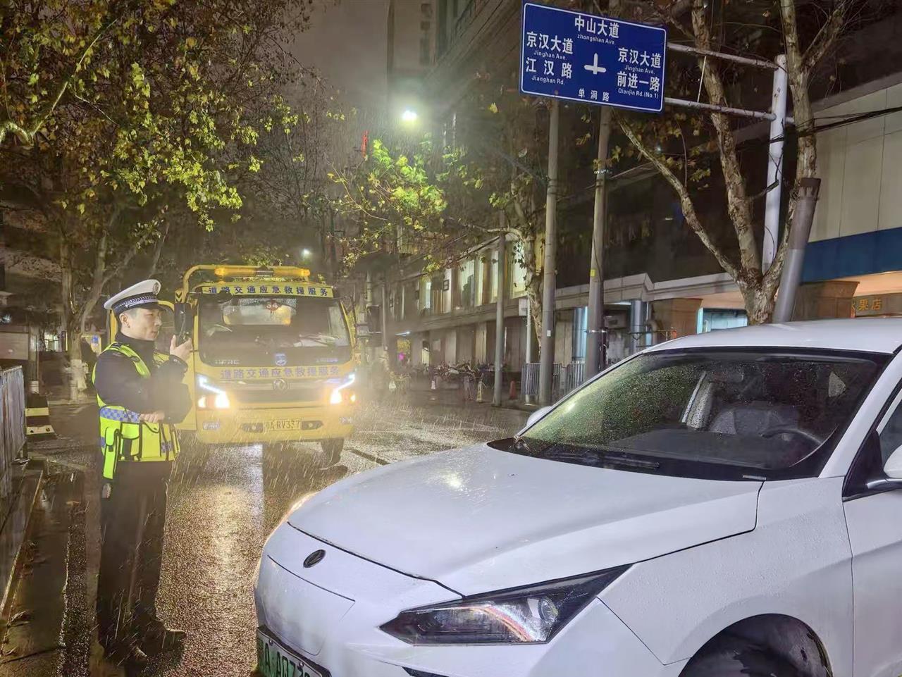 在保证安保工作的同时,江汉公安还高效处置多起突发情况。19时许,指挥室接到警情:江汉区单洞路路面停放着一辆白色故障小车,驾驶员不在现场,严重影响车辆通行。指挥室立即指令附近执勤民警廖慧赶赴现场处置。抵达现场后,廖慧一方面通过指挥室快速联系车主,一方面协调牵引车到场。寒风冷雨中,他全程疏导周边车辆有序通行,同时指挥牵引车将故障车辆安全移至不影响交通的区域,快速恢复道路通行秩序,以高效处置彰显为民服务的责任担当。