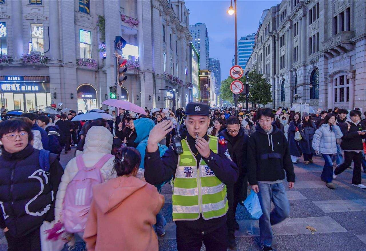 记者在中山大道与步行街交会处看到,执勤民警实时紧盯人流变化,动态调整工作策略。人流平峰时段,各岗位警力主动巡查,精准掌握人流流向,提前开展疏导引导;进入高峰时段,现场指挥部即时下达指令,各单位迅速用隔离“水马”对关键路口、路段实施临时封控,安排专人定点引导,保障区域内人员有序分流,严防拥挤踩踏风险。同时,民警同步开展人员核查与物品查控,及时排除安全隐患,维护现场治安稳定。