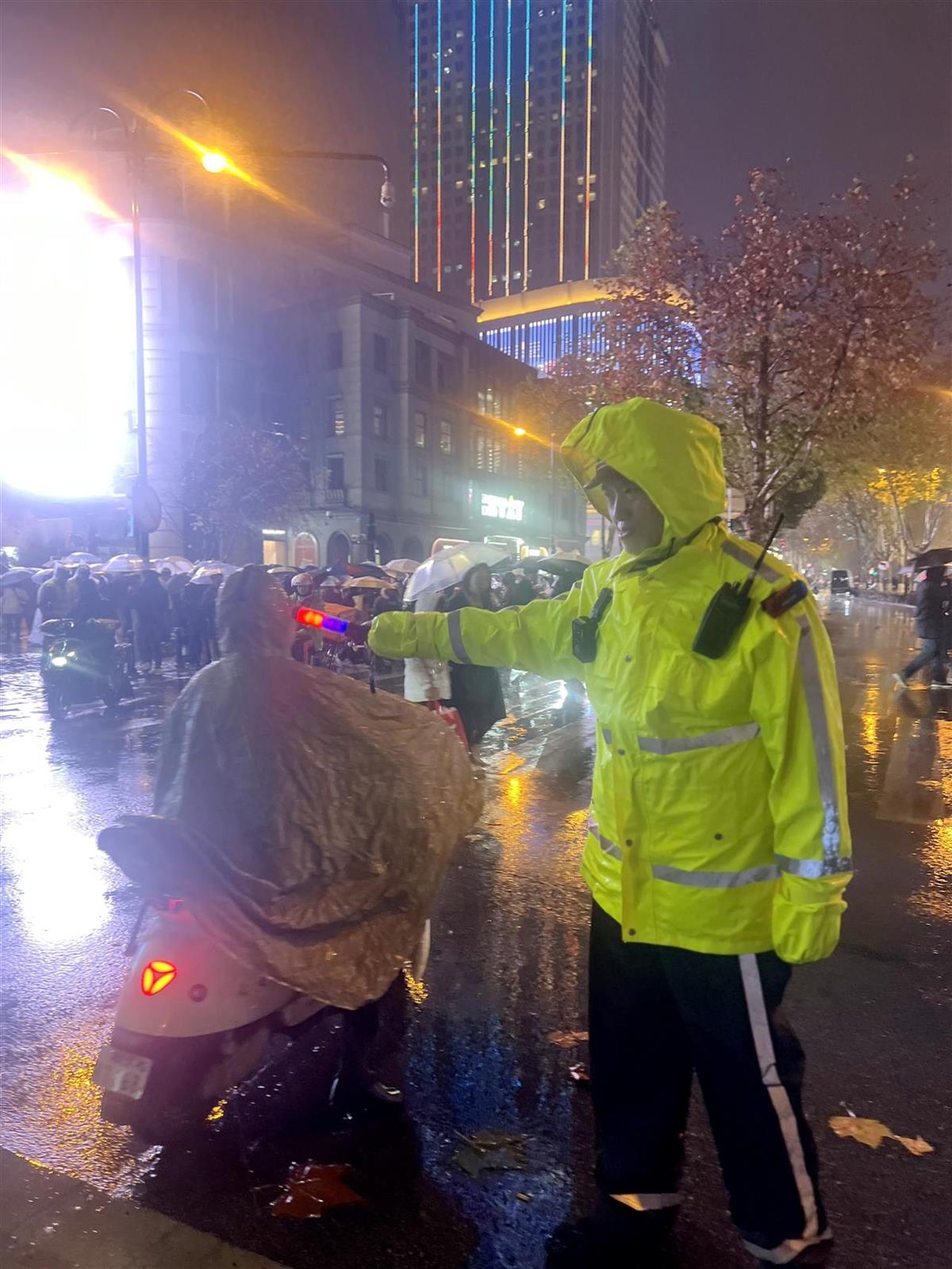 大雨中,执勤人员坚守岗位,一边持续引导人群有序行进,一边用扩音器循环提醒市民“注意路滑、谨慎慢行”,同时及时劝离试图倚靠隔离设施的游客,防止设施倾倒引发危险。通过强化关键点位定点值守、机动警力动态巡查与实时疏导相结合的工作机制,警方确保了封控区域内大规模人流的安全有序流动,即便雨势未歇,现场通行秩序整体平稳。