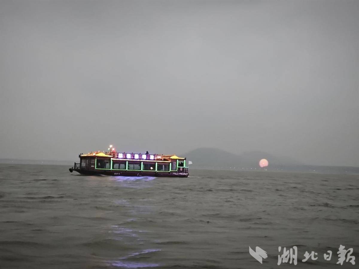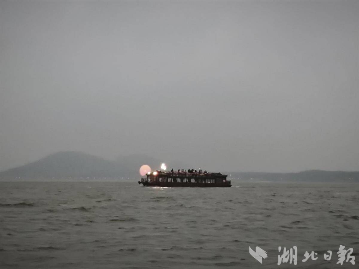 就在此时,有游客望向窗外忽然惊呼:“看,远处好像有朝阳!”当游船行至凌波门码头附近时,对岸磨山方向竟浮现出一轮朦胧的红色光晕。