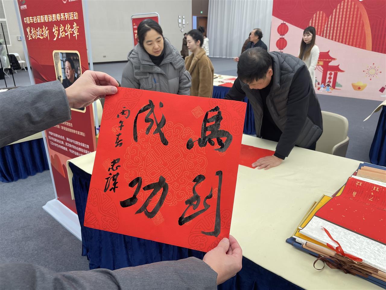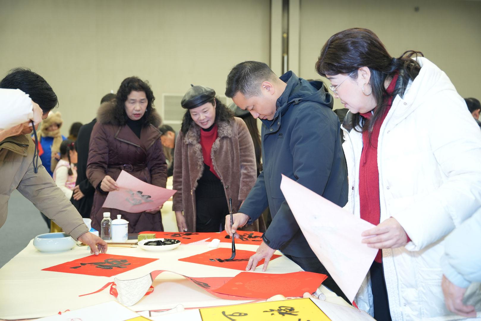 现场,多位书法家饱含热情,书写着寓意满满祝福的“福”字。市民们围在书法家的周边,有的帮忙压纸,有的挑选自己心仪的书法作品,脸上洋溢着幸福的笑容。
