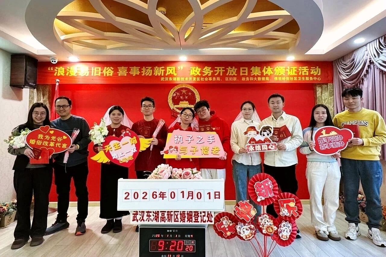 2026年1月1日,是《中华人民共和国民法典》实施五周年纪念日,武汉东湖高新区政务服务中心婚姻登记处举办了“浪漫易旧俗,喜事扬新风”集体颁证活动,为125对准新人集体颁证。