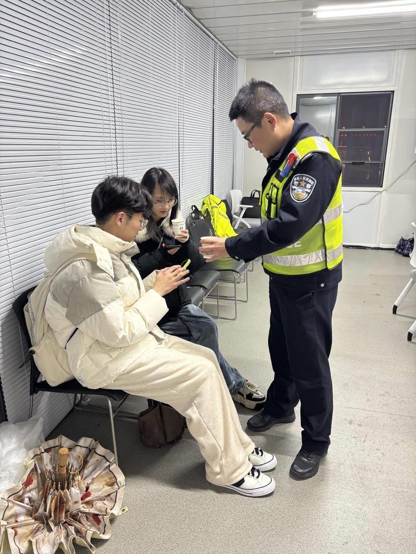 21时许,雨雪愈发密集,紫阳街派出所民警张琛锴在武昌湾警务室执勤时,发现两名年轻人撑着伞在室外瑟瑟发抖、焦急等候。他立即上前将二人请进警务室,递上温热的开水为他们驱寒取暖。经询问,两人本打算前往武昌江滩观看跨年光影秀,却遭遇气温骤降、雨雪突袭,半个多小时都未能打到车。在警务室稍作休整、暖意回暖后,民警李一夫、辅警汤进主动驾驶警车,冒着雨雪将二人安全送至复兴路地铁站。“感谢警察叔叔,祝愿你们在新的一年平平安安。”临别时,两名学生的声声感谢,成为寒夜里最动人的旋律。