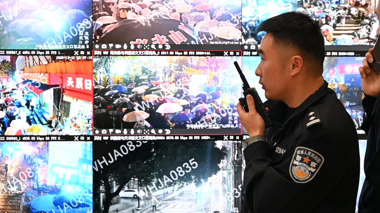 数千名安保警力精准布设在沿江大道、南京路、青岛路、吉庆街、黎黄陂路等人流密集区域,织就无声却有力的平安矩阵。“天冷路滑,大家执勤时注意自身安全,也多提醒市民放慢脚步。”武汉市公安局江岸区分局网安大队副大队长潘黎不忘叮嘱身边的同事。