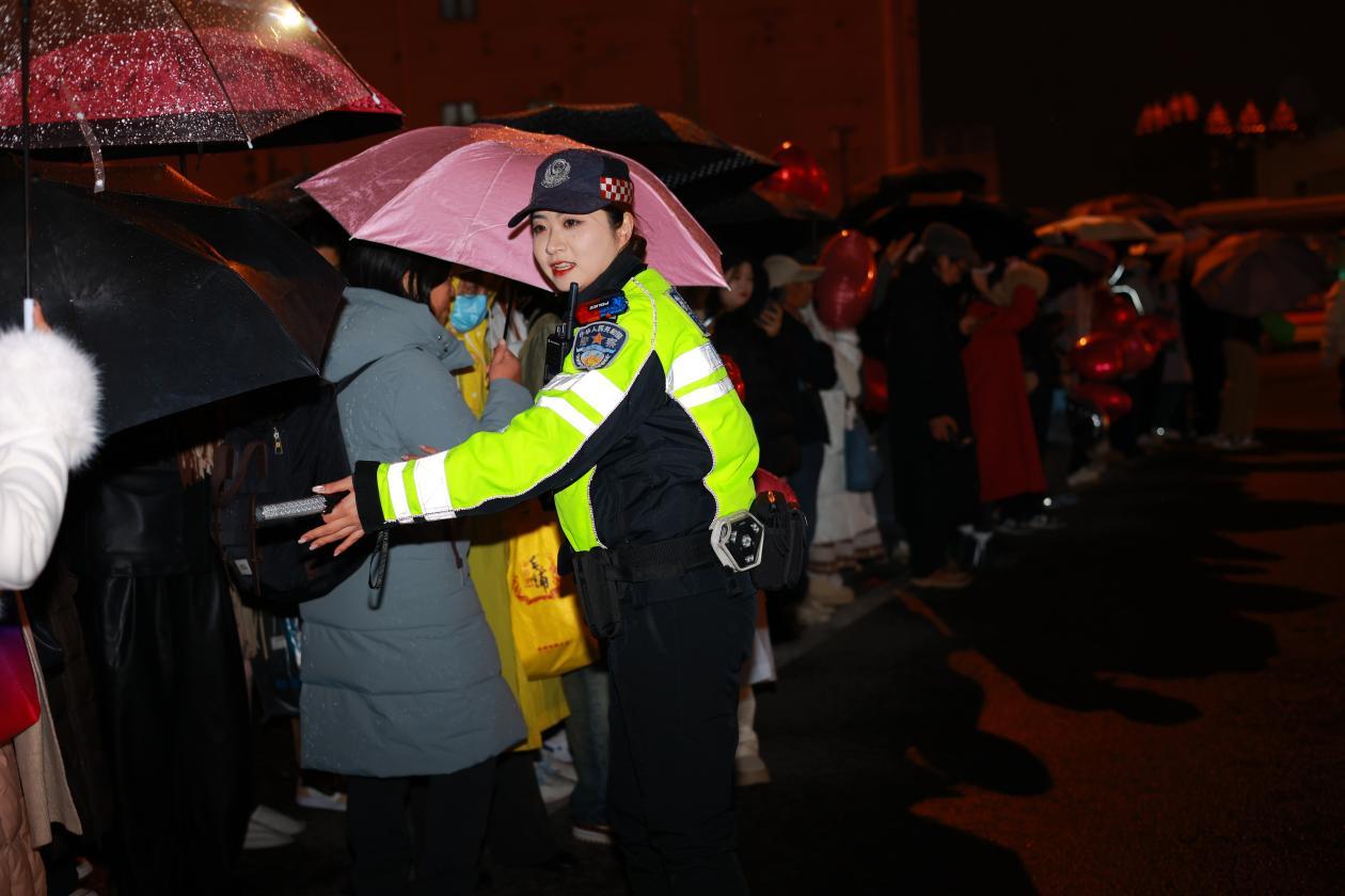 “青岛路方向人流量开始增加,雨天路滑,建议增派警力在路口疏导。”在当晚10时许,人潮从四面八方涌来,对讲机里传来实时监测情况,此次安保工作充分发挥了智慧警务的效能。