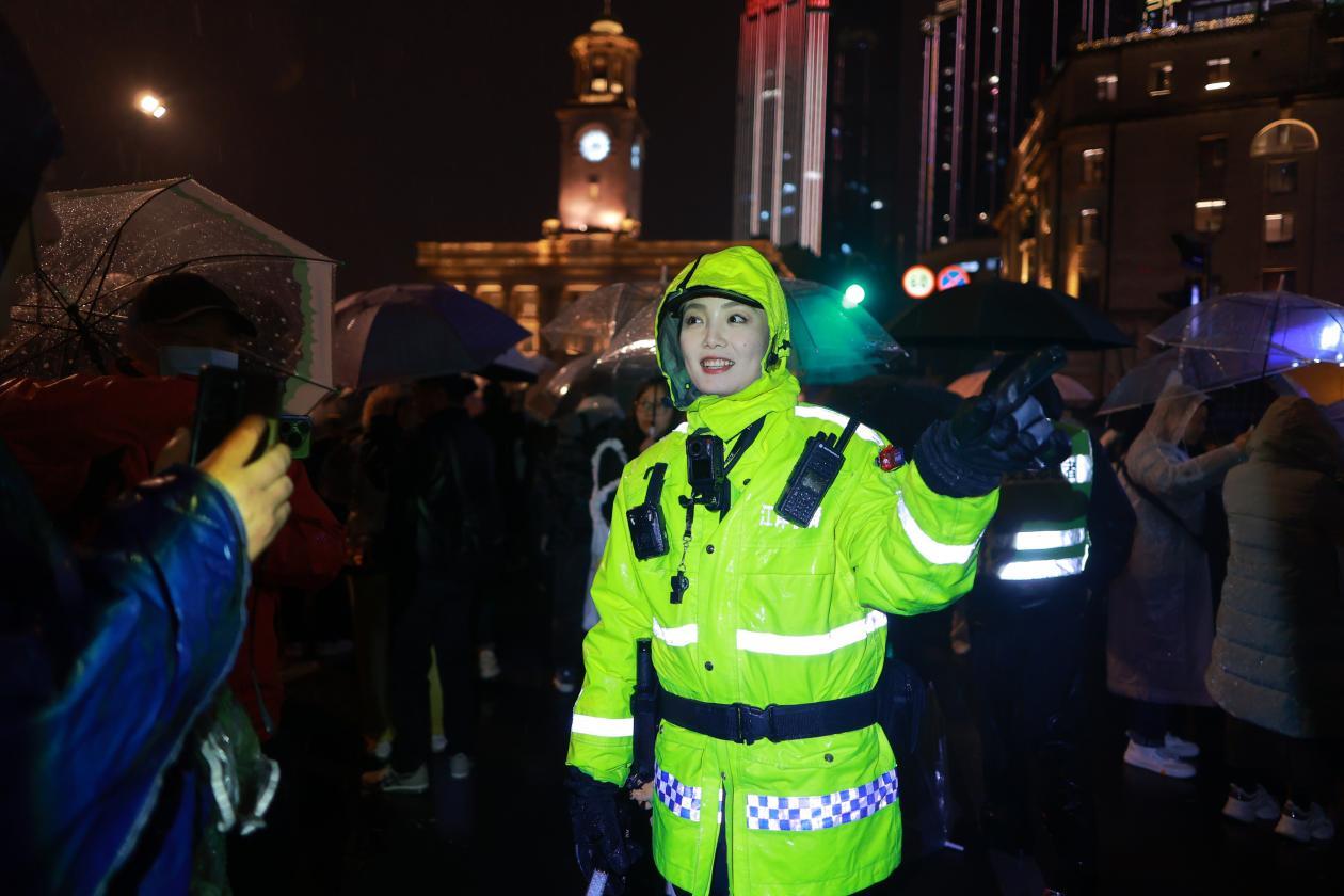 “3、2、1”新年的钟声响起,雨水夹着雪花,人群的欢呼声却愈发高涨。“大家不要急,注意脚下安全,新年快乐!”江岸交警江雅莉穿梭在人群中,不断提醒着身边的群众,专注地守护着现场秩序。