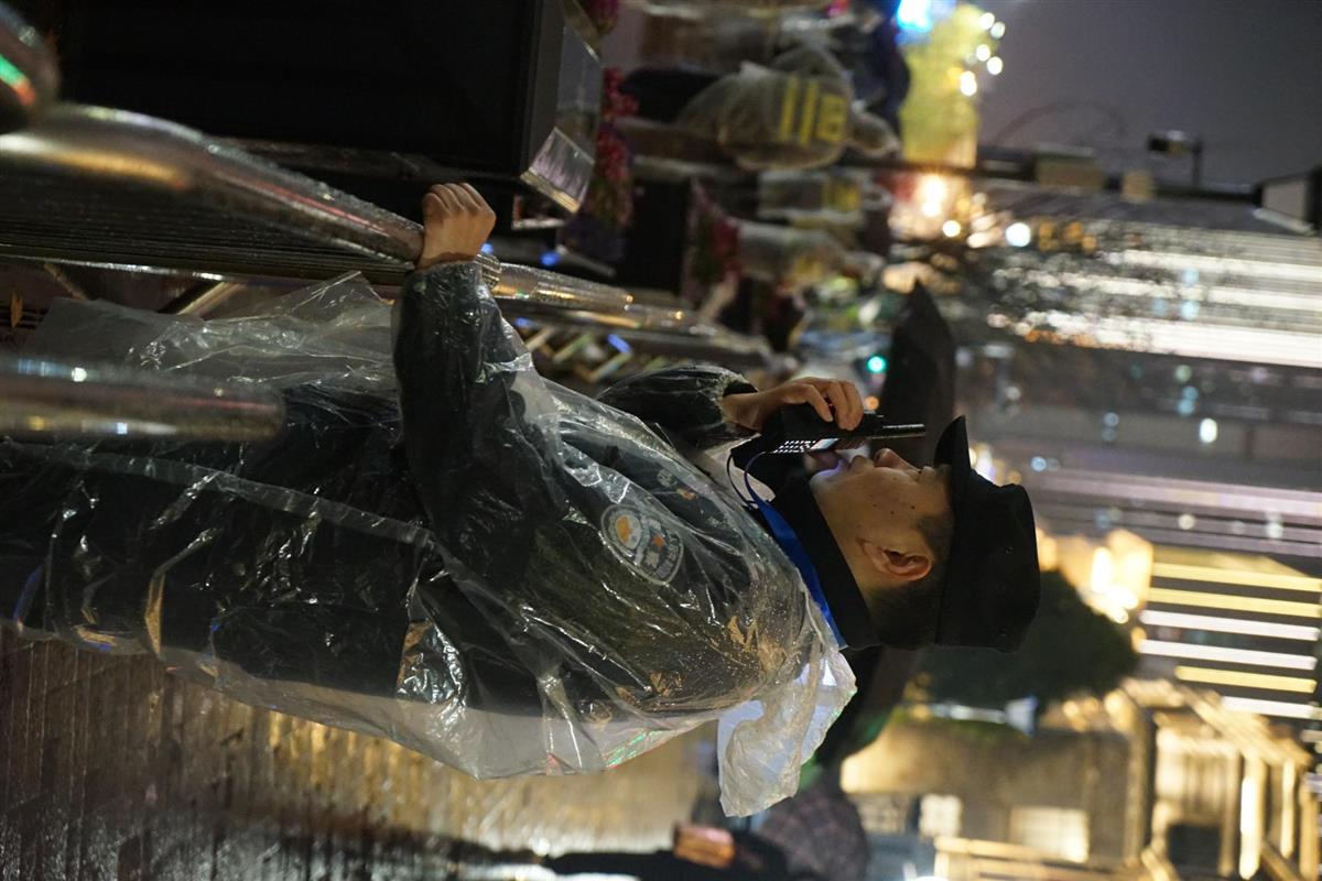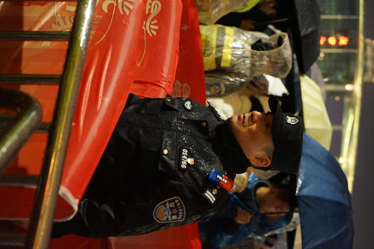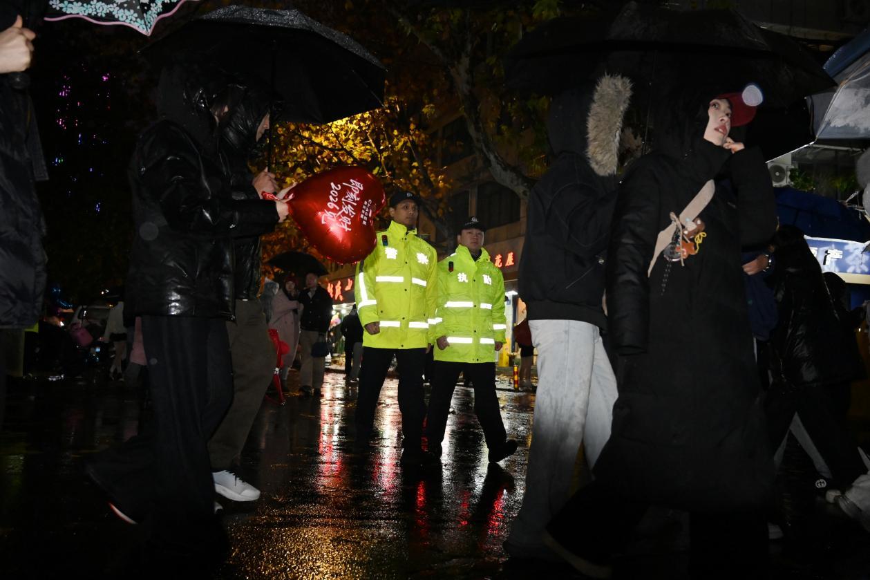 雨水顺着他的帽檐滑落,在警服胸前晕开一小片湿痕。他们在欢腾的人海间默默伫立,雨水打湿了发梢、浸透了鞋袜,却用坚守点亮了新年的第一盏平安灯火。