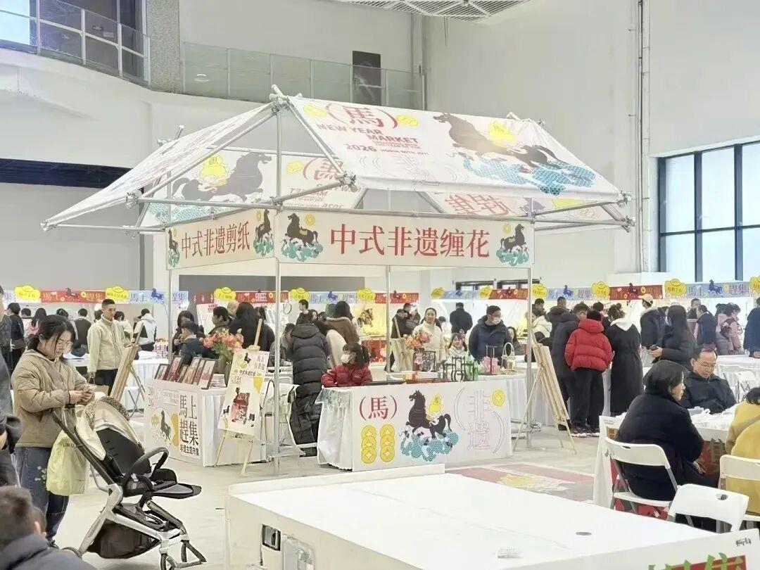 上午11点,永旺梦乐城武汉经开购物中心停车场已接近饱和,商场内人头攒动,穿着红衣的孩子们被家长高高举起,笑声此起彼伏。“马上有非遗”主题集市上,剪纸、缠花、香囊制作等非遗摊位被亲子家庭层层围住,孩子们在指导下动手体验。“让孩子摸摸传统文化的脉搏,比单纯购物更有意义。”带着女儿制作香囊的吴先生表示。