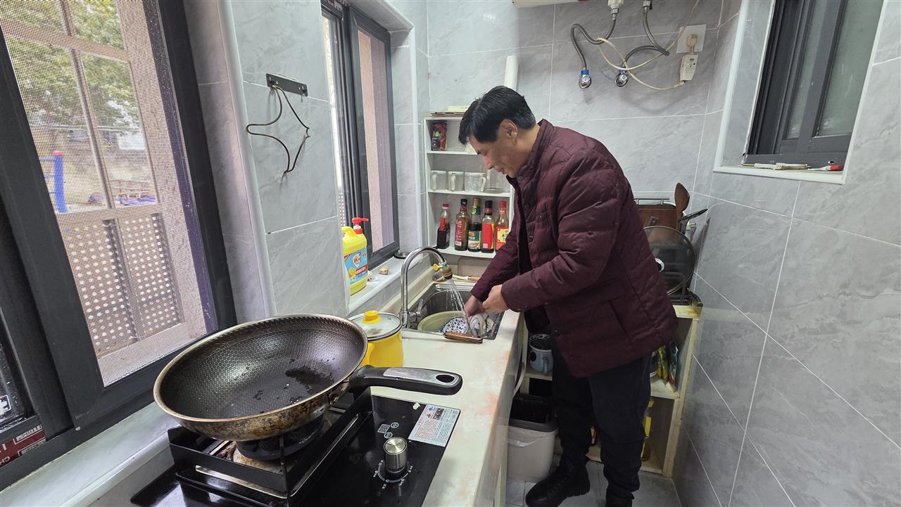 聂师傅在翻新后的厨房里做饭