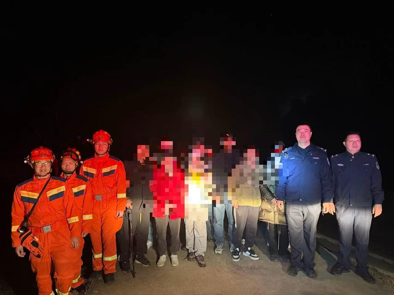 山林漆黑一片,山路陡峭湿滑,部分石面结冰,民警辅警没有丝毫犹豫,打开手电筒,手脚并用,蹬石扒岩。经过两小时努力,终于在野山顶与受困群众会合,随后搀扶引导群众下山。当晚10时,12名受困群众全部安全获救。