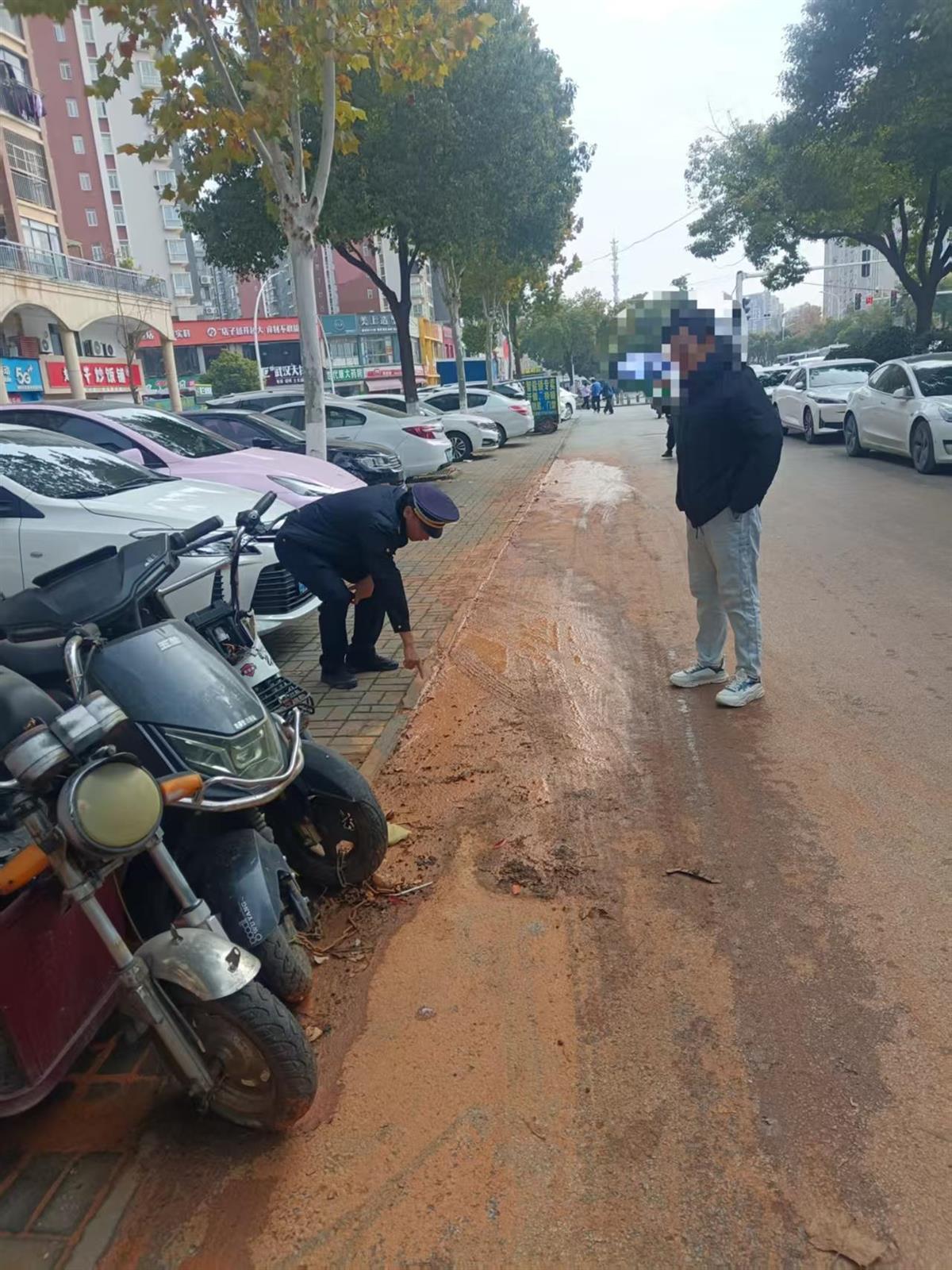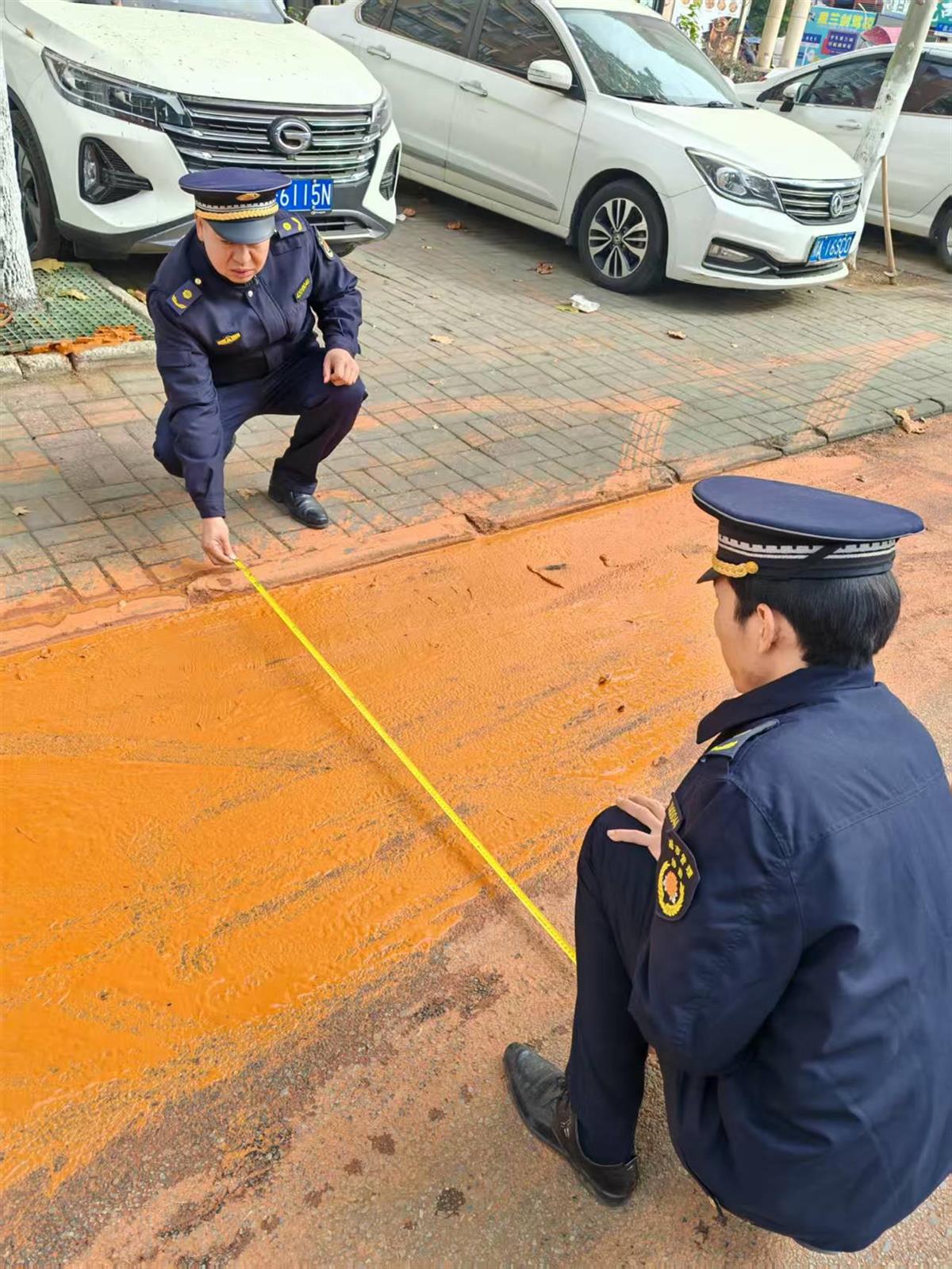 2025年12月15日,黄陂城管盘龙中队接到市民反映称,位于巨龙大道美景天城辅道上有人施工,造成较严重路面污染。城管执法人员接到投诉后立刻赶往现场,只见现场地面上存有大量黄色污泥。