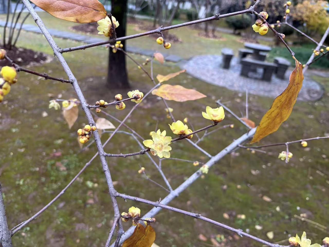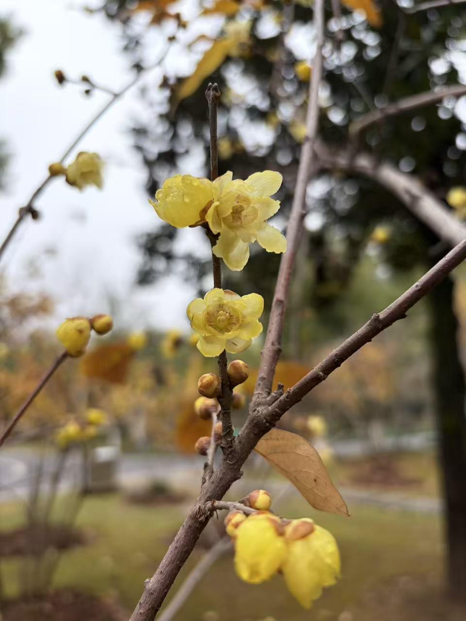 步入公园,远远便闻见清冽的暗香,那气息不似春芳浓烈,却像冬日的私语,裹着寒意钻进衣领。凑近看,金黄的花盏或半绽、或全开,花瓣上凝着细润的水珠,衬着深褐的枝丫与残存的枯叶,又添了几分“疏影横斜水清浅,暗香浮动月黄昏”的幽韵。偶有风过,花瓣轻颤,暗香便随冷风漫开,引得散步的市民驻足,或举着手机轻拍,或俯身轻嗅,将这冬日光景妥帖地收进眼底。