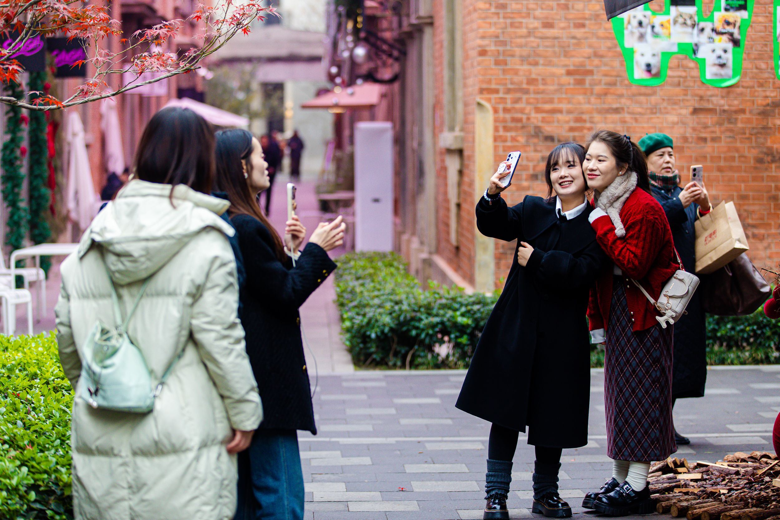 她分享道,吸引她们专程前来跨年的,正是小红书上刷屏的“武汉”涂鸦墙、满月形月亮门以及将心形光影洒在红墙上的独特氛围。傍晚亮灯后,老建筑更添温柔,她们坐在路边喝咖啡聊天,“感觉时间都慢下来了”。