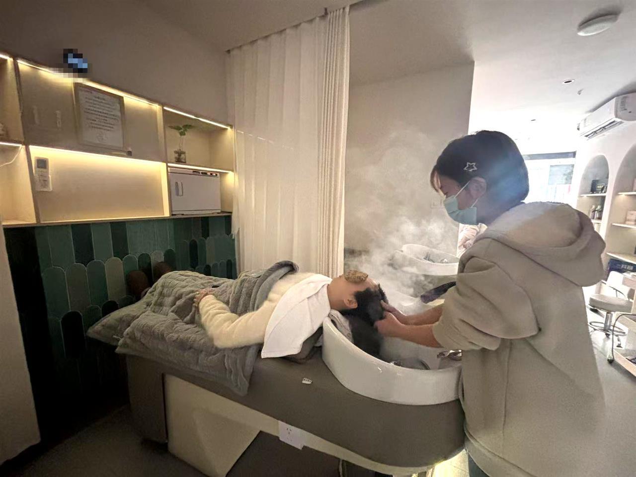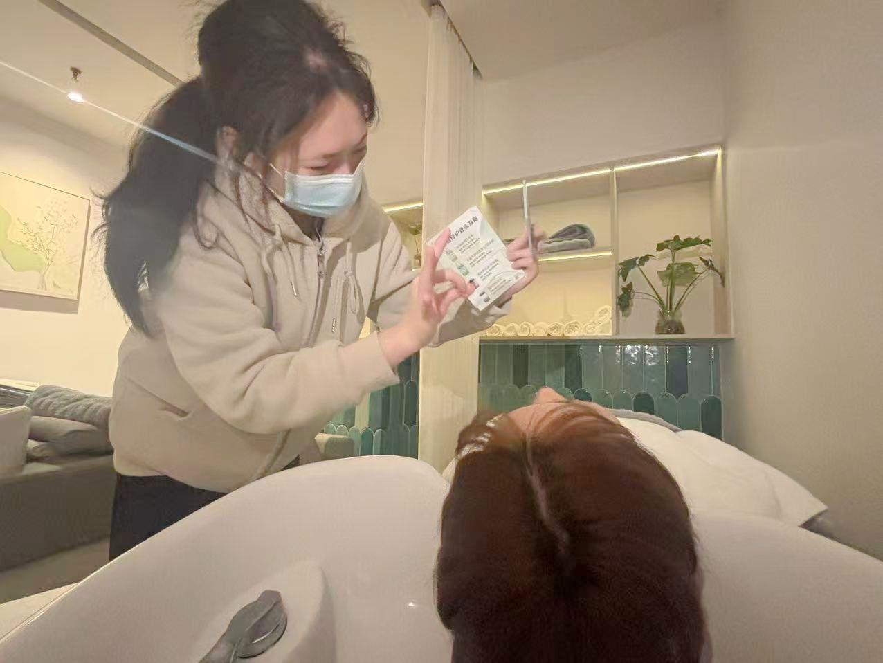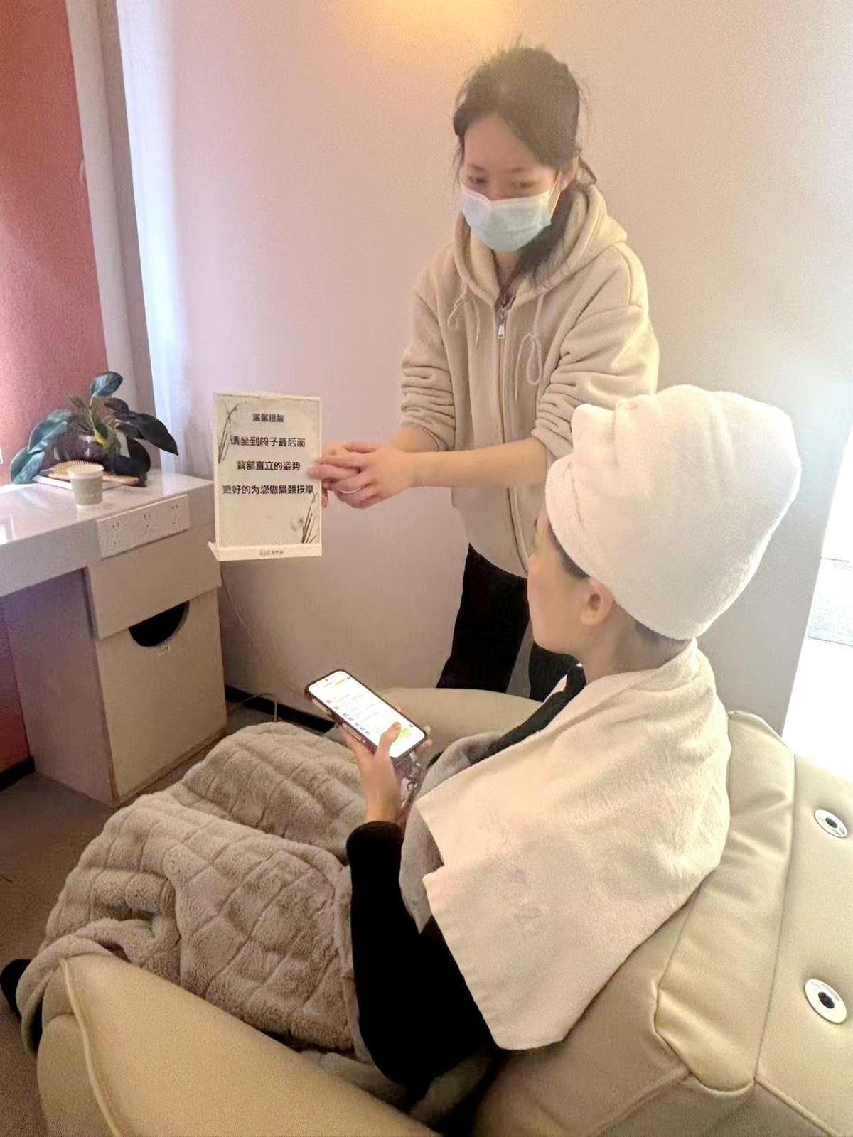 记者发现,每位护理师的操作台上,都放着一块巴掌大的双面手牌。洗头发时,若需要调整力度,护理师会轻轻停下动作,指尖点一点手牌——一面印着“轻一点”,另一面是“重一点”,眼神里带着温和的询问。顾客只需轻轻点头或摇头,便能完成精准沟通。没有多余的言语,这份心照不宣的默契,搭配着轻柔的音乐,让整个店内都透着静谧的治愈感,这也是小店最独特的魅力所在。