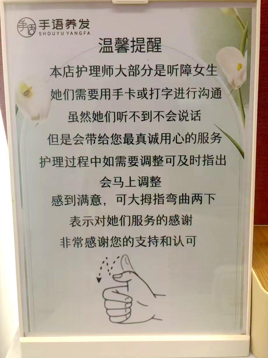 在武汉市江汉区精武路的街巷深处,一家“手语养发店”悄悄传递着暖意。暖黄色的灯光透过玻璃窗漫出,推开门,轻柔的轻音乐缓缓流淌,前台立着一块温馨提示牌,清晰写着“本店护理师大部分是听障女生”。店内没有聒噪的推销,店主王心对着一位准备接待顾客的护理师,用双手比出一连串轻柔的手语,示意核对服务项目。护理师点头回应,眼神交汇间尽是默契。周围只剩护理师专注操作的细碎声响,每一处细节都透着让人安心的治愈感。