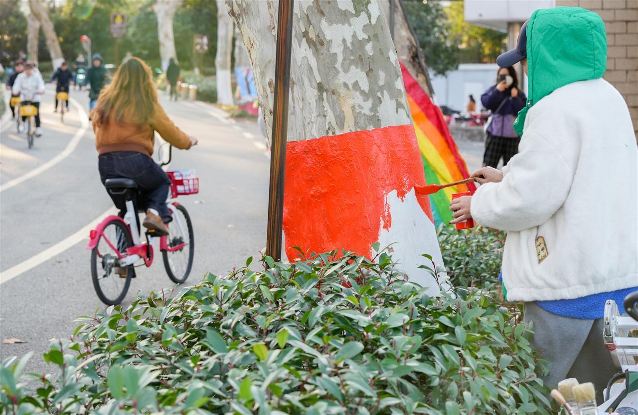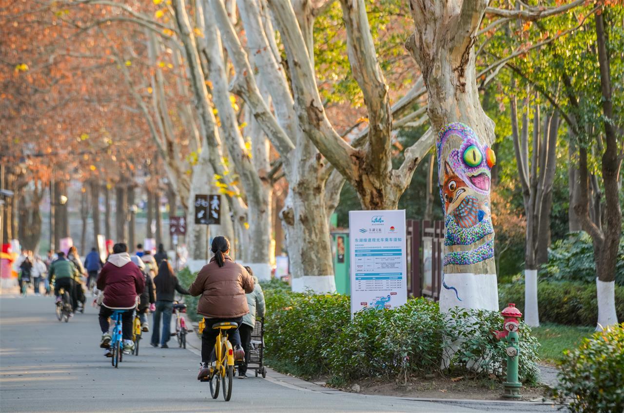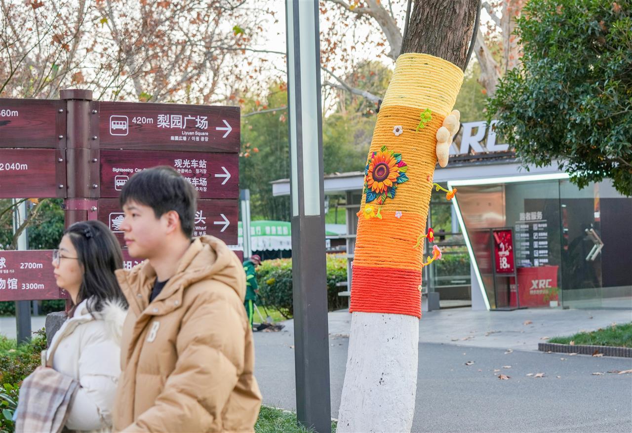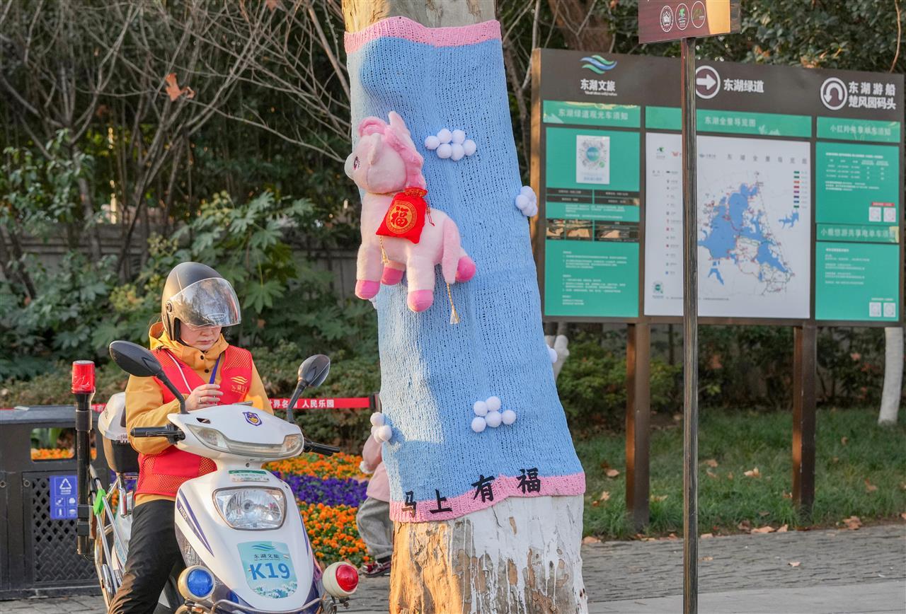 近日,武汉东湖绿道悄然换上“彩妆”——从梨园大门到九女墩路段,近百株大树或穿上彩色针织“毛衣”,或被画上惟妙惟肖的动物与风景,昔日的绿道俨然变身童趣满满的“东湖彩道”,成为市民游客打卡新热点。
