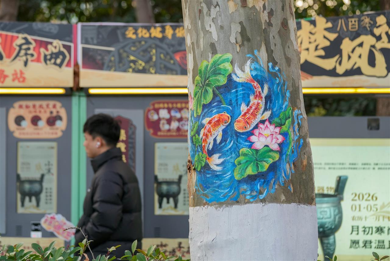 据了解,此次美化工程始于2025年12月下旬,目前已完成近100株大树的装扮。为烘托节日氛围,画师还将融入楚文化元素、武汉地标及马年特色设计,春节前计划完成约200株树木的创意装饰。所有装扮将保留至樱花季,让市民游客在春日赏樱时仍能感受这份灵动趣味。