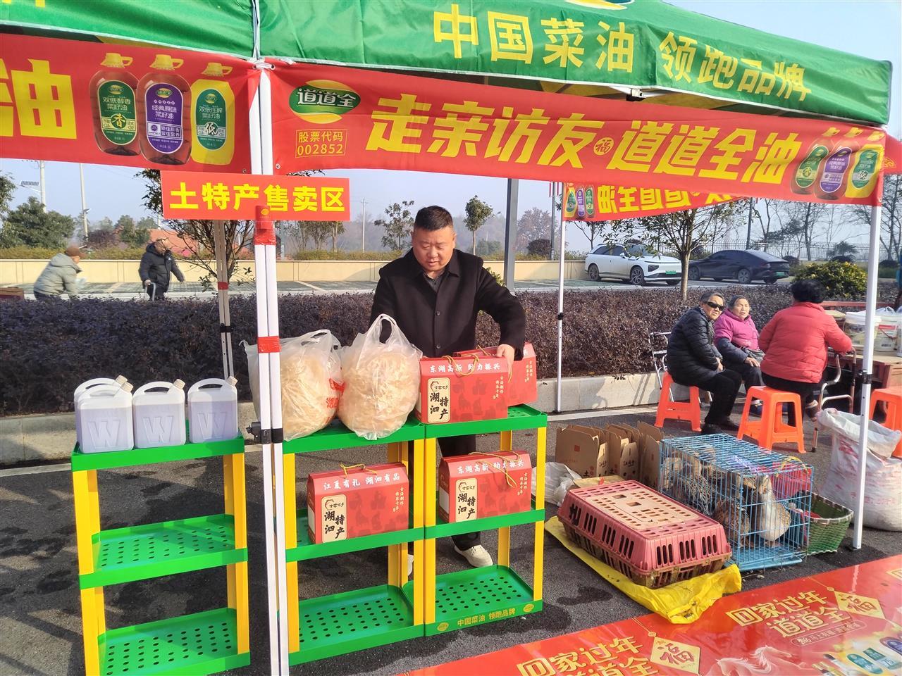 活动现场,两排黄绿色的大帐篷沿着村湾道路依次排开,形成了一条热闹的集市。前端是粮油公司的展位,整齐摆放着包装精美的菜籽油、大米等农产品礼盒。往里走,便是各村自己的特色展区:色泽紫红、茎秆饱满的洪山菜薹成捆地码着,金黄的豆腐角堆满竹筐,农户带来的土鸡土鸭装在笼中,旁边还有成罐的手工菜籽油、成篮的散养鸡蛋。每个摊位前都围着不少村民,有的在问价格,有的在挑品相,交谈声、询价声此起彼伏。