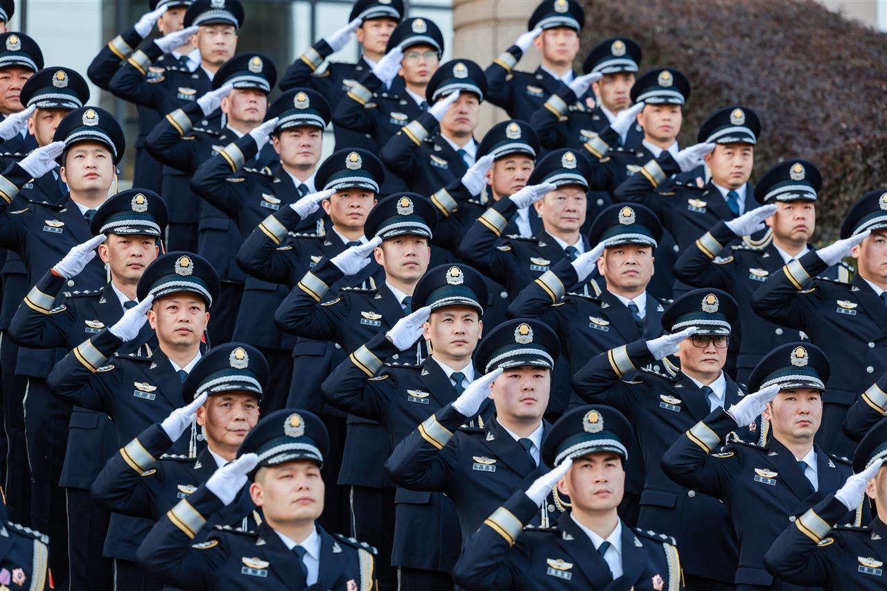 “向中国人民警察警旗——敬礼!”上午9时30分,伴随着一声响亮的口令,民警们神情庄重,面向缓缓升起的警旗整齐举手敬礼。激昂雄壮的《中国人民警察警歌》响起,红蓝相间、警徽熠熠的中国人民警察警旗在阳光中冉冉升起,格外醒目。
