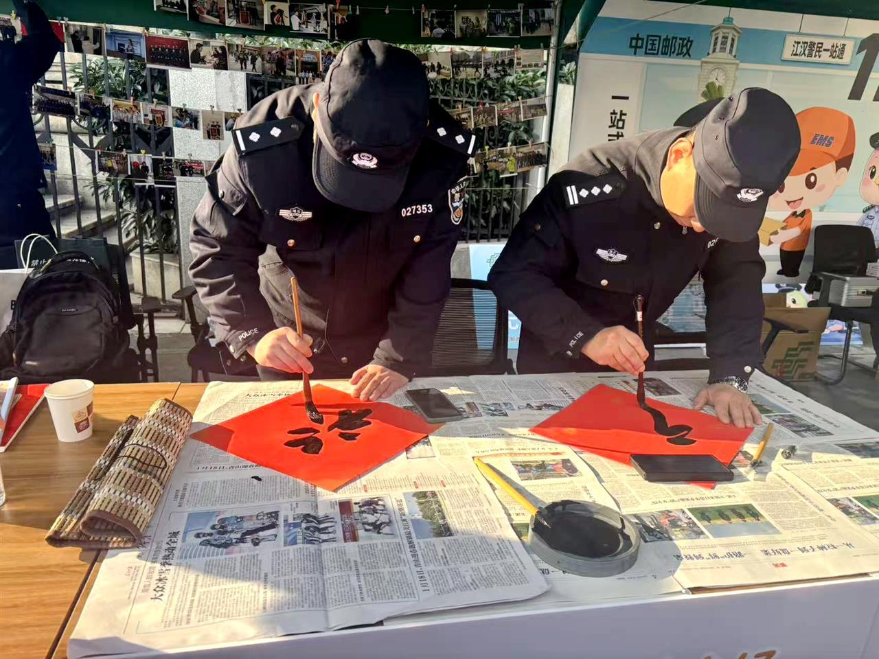 互动区内热闹非凡,其中写福字、送春联的摊位前更是排起了长长的队伍,暖意融融。只见民警手握毛笔,凝神挥毫,一撇一捺间,一副副笔力遒劲的春联、一个个饱满喜庆的“福”字跃然纸上。墨香氤氲间,浓浓的年味与警民深情扑面而来。
