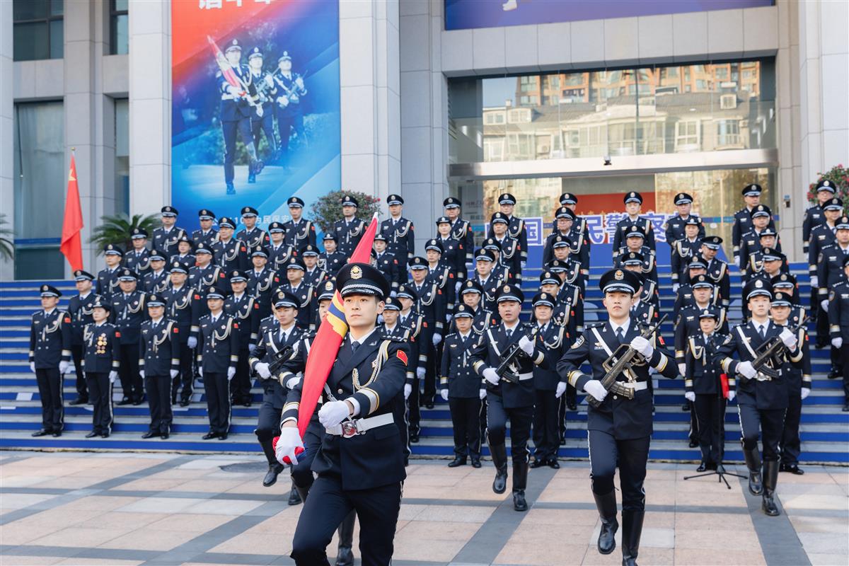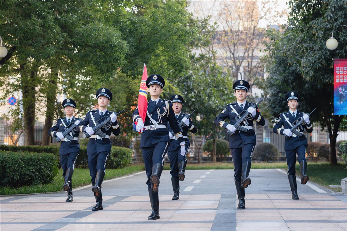 “齐步——走!”一声洪亮的口令划破长空。6名挺拔的护旗手肩擎红蓝相间的警旗,迈着铿锵有力、整齐划一的正步,护卫着神圣的警旗,坚定地走向升旗台。每一步都踏出钢铁般的纪律,每一次摆臂都挥洒着无悔的担当。阳光洒在熠熠生辉的警徽上,照亮了他们年轻而坚毅的脸庞。