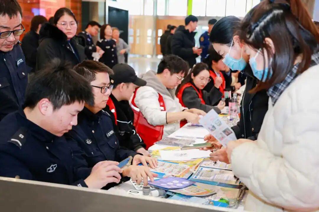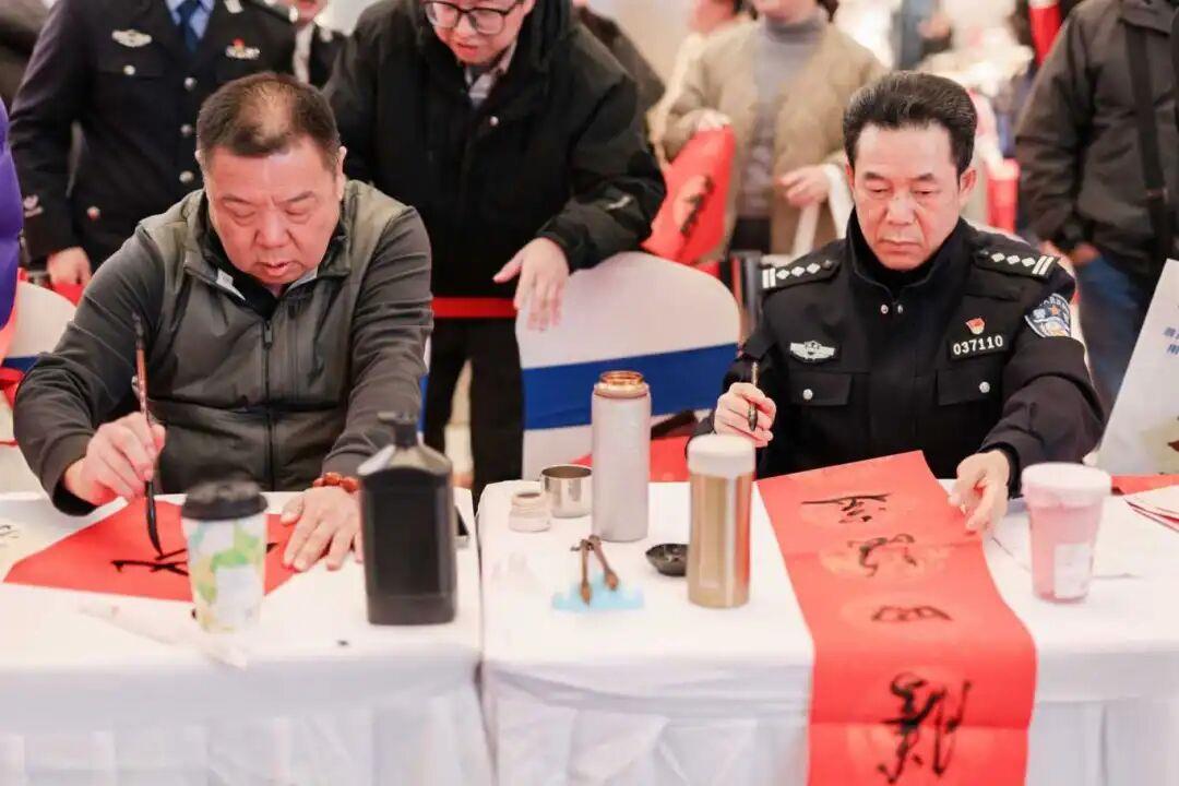 舞台一侧,民警“书法家”们依旧笔走龙蛇,免费为市民书写春联,送上新春祝福。一旁的“警茶”摊前暖意融融。禁毒、反诈、文明养犬等宣传展台前,市民们认真聆听讲解,完成“打卡集赞”,在收获实用知识的同时,也领取到了车谷公安定制的特色纪念品。