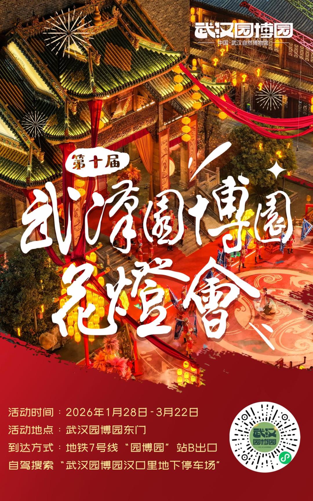 第十届武汉园博园花灯会以“万马奔腾贺新春·千灯璀璨耀江城” 为主题,将于2026年1月28日至3月22日举办,展期共54天。届时,月色映灯山,光影满园博。武汉规模最大、灯组最丰富、游览线路最长、文化活动最密集的新春灯会即将璀璨登场。