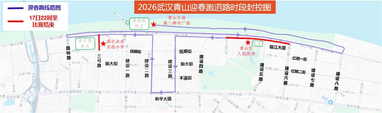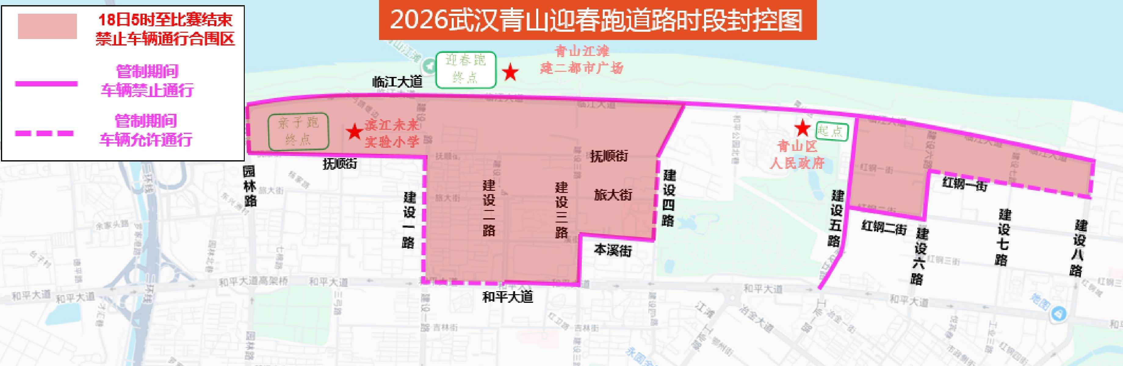2026年武汉青山迎春跑将于元月18日在青山区举行。为保障赛事安全、有序进行,根据相关法律法规,赛事期间将对部分道路采取临时交通管控措施,相关交通出行建议如下: