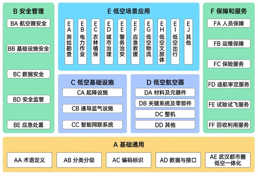 《指南》立足武汉资源禀赋和产业基础,构建了覆盖低空经济全产业链的标准体系,采用“纵向三层+横向两翼”的立体化设计,包含六大子体系。