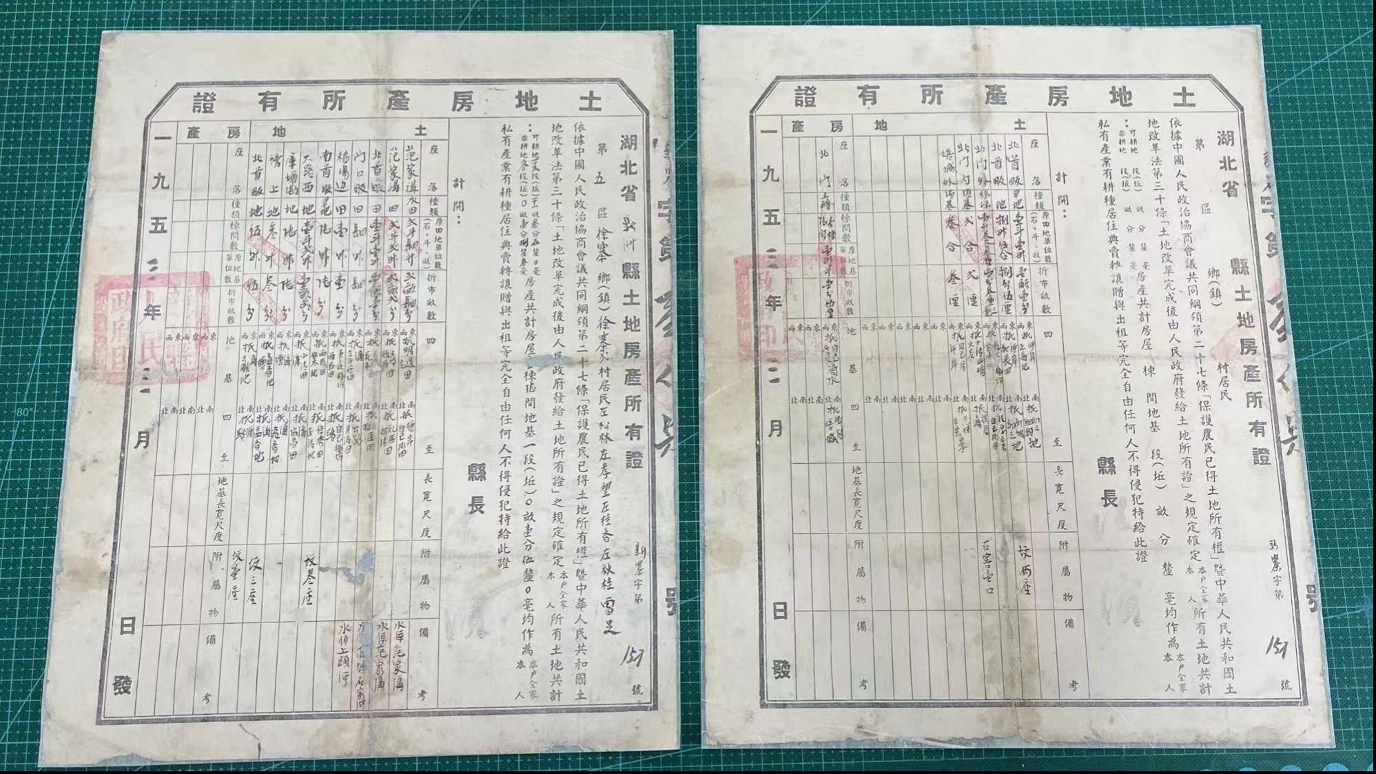 据历史资料记载,1950年,中央人民政府颁布《中华人民共和国土地改革法》,湖北省于1952-1953年完成全省农村土改任务。这两张《土地房产所有证》,就是当时农民“耕者有其田、居者有其屋”的法律凭证。证书上清晰记载着户主姓名、家庭人口、土地房屋的坐落、四至、面积等核心信息。