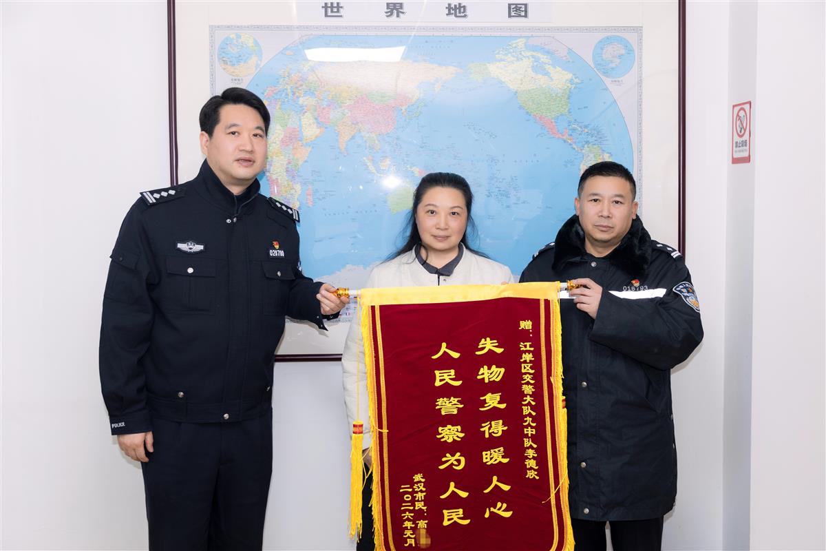 为表达谢意,高女士专门定制了一面锦旗,希望亲手送到这位热心交警手中。见面后,她发现,这位帮她找回失物的正是江岸区交通大队九中队中队长李德欣——与她有着多年合作的老朋友。