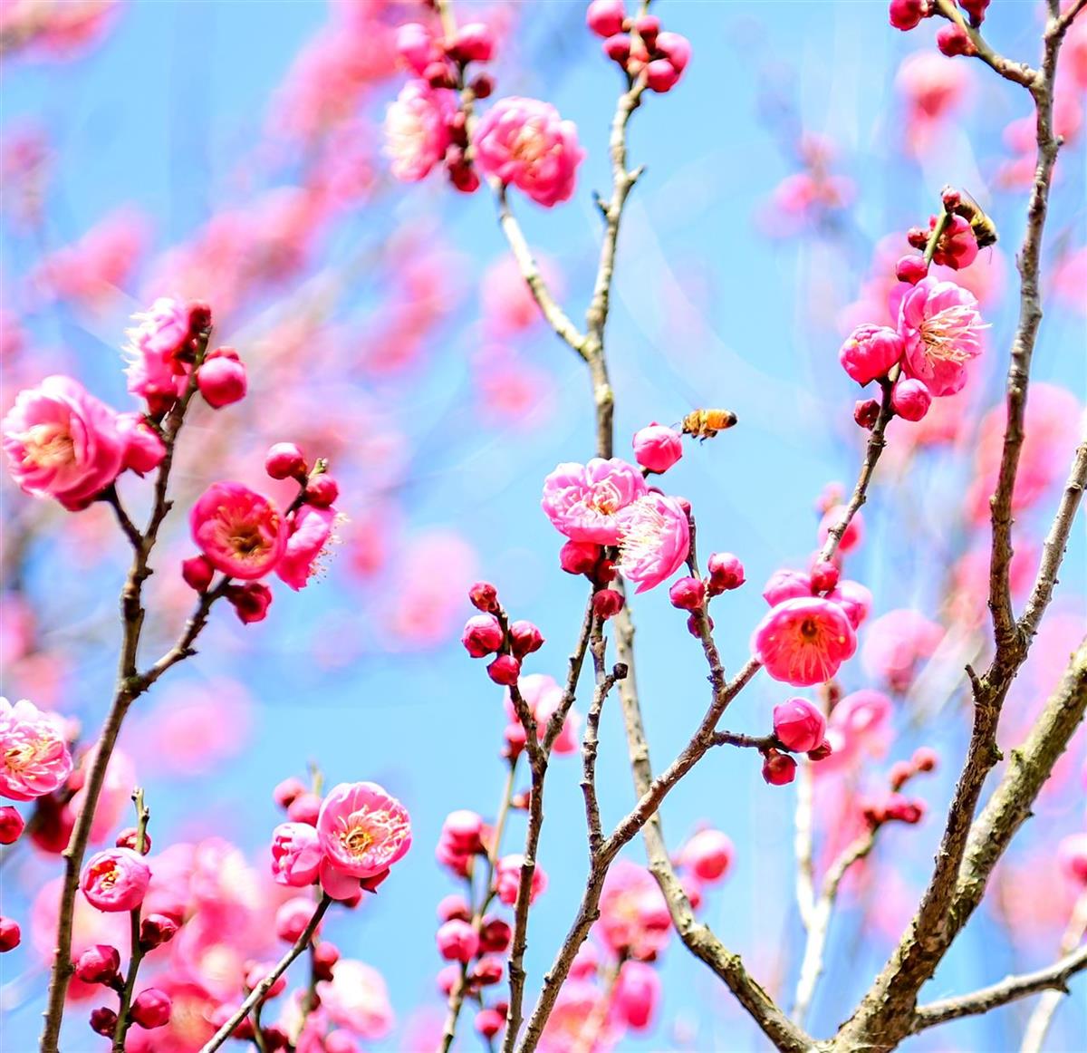 踏入梅园,不同于盛花期的绚烂夺目,初绽的红梅更显清逸雅致。苍劲的枝干上,一朵朵红梅疏密有致地分布。有的含苞待放,像红宝石般点缀在褐色枝干上;有的早已吐蕊迎红,重重叠叠的花瓣在明媚的阳光下显得格外晶莹剔透。微风掠过,纤细的花枝轻轻摇曳,缕缕暗香若有似无,沁人心脾,引得勤劳的蜜蜂在花间忙碌穿梭。